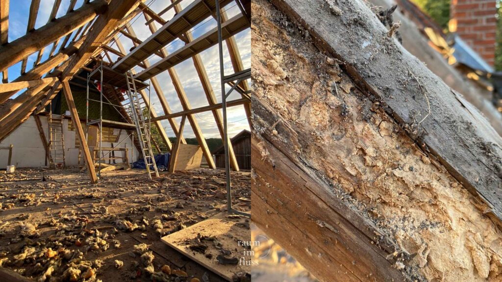 - Mögliche Einschränkungen: Nicht alles dürfen wir einfach verändern – dies betrifft zum Beispiel die Türen und Fenster (bei uns sind Holzfenster vorgeschrieben) oder die Dachpfannen. Auch mussten wir die alten, zerfressenen Dachsparren stehen und den neuen Dachstuhl daneben errichten lassen, weil sie zeigen, wie damals Dachstühle gebaut worden sind – man hat zum Beispiel ganze Bäume als Sparren benutzt).