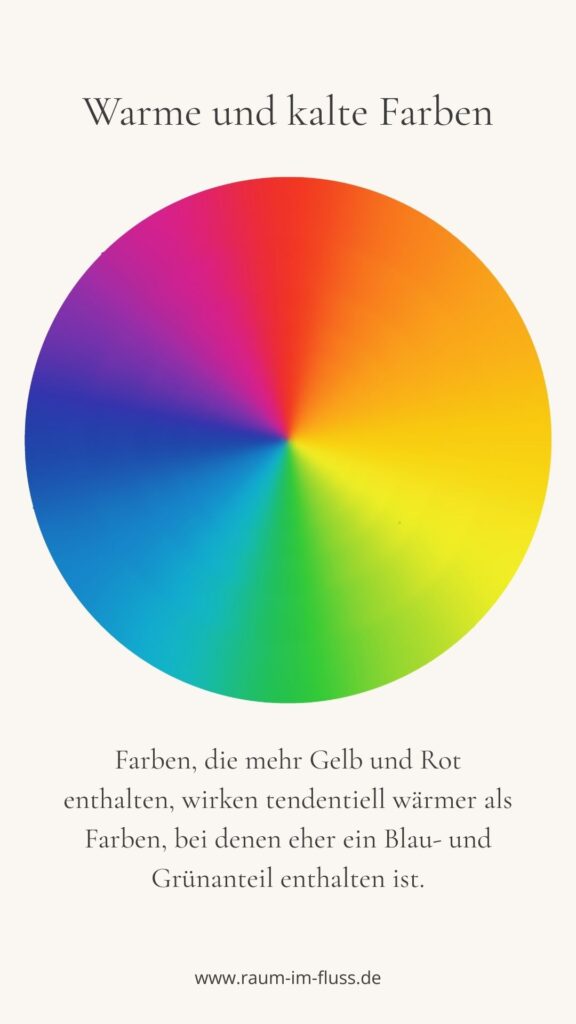 Doch auch andere Farben haben warme Varianten: warmes Beige, Creme, Sand, Terrakotta, Pfirsich, Koralle, Rost oder warmes Braun. Sogar Grün- und Blautöne können warme Farben sein.