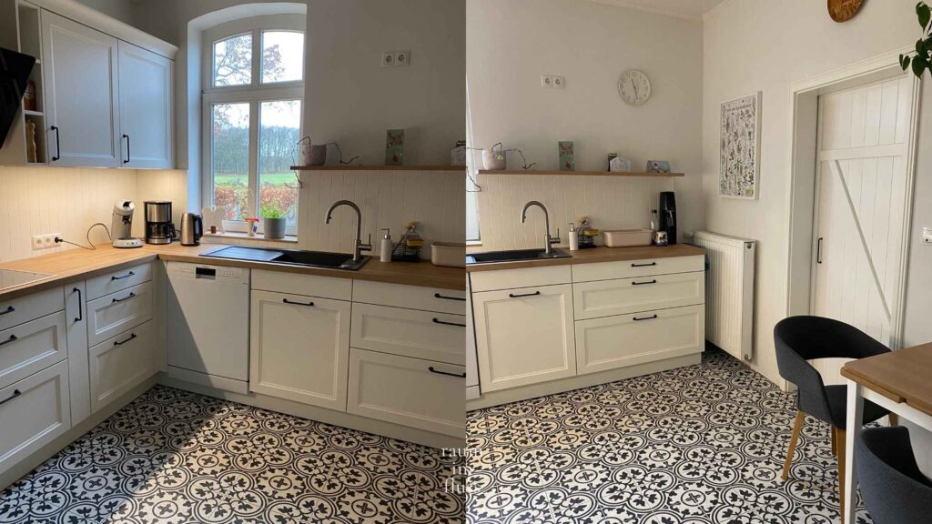 Wir haben aus diesem Grund unsere Küche sehr hell gestaltet. Der Raum ist recht klein und wir haben für die Küchenmöbel weiße Schränke im Landhausstil, passend zu unseren Haustüren und Fenstern gewählt. Die Wand ist mit einem hellen creme/beige gestrichen und auf dem Boden haben wir schwarz-weiße Fliesen in Zementoptik.